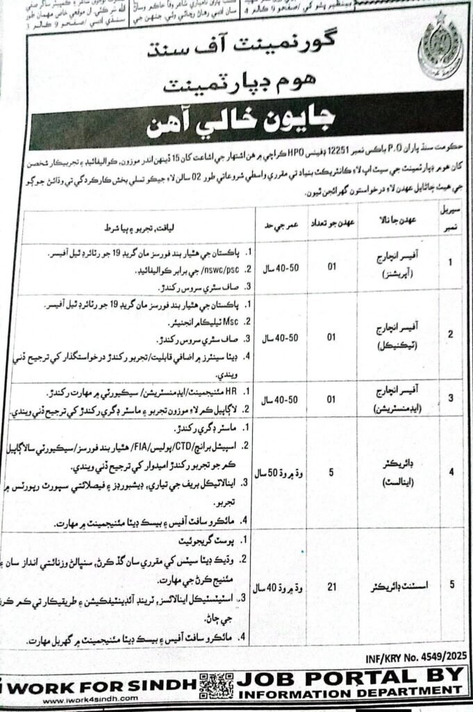 The Sindh Home Department has released a new job announcement for 2026, inviting applications through a formal newspaper advertisement. A range of vacancies is available on both permanent and contract terms across various departments for qualified candidates from Sindh. Individuals who fulfill the prescribed educational and experience requirements are advised to submit their applications within the given timeframe. This hiring initiative offers a valuable chance for job seekers aiming to secure government employment in Sindh, particularly in administrative, technical, and support service positions.